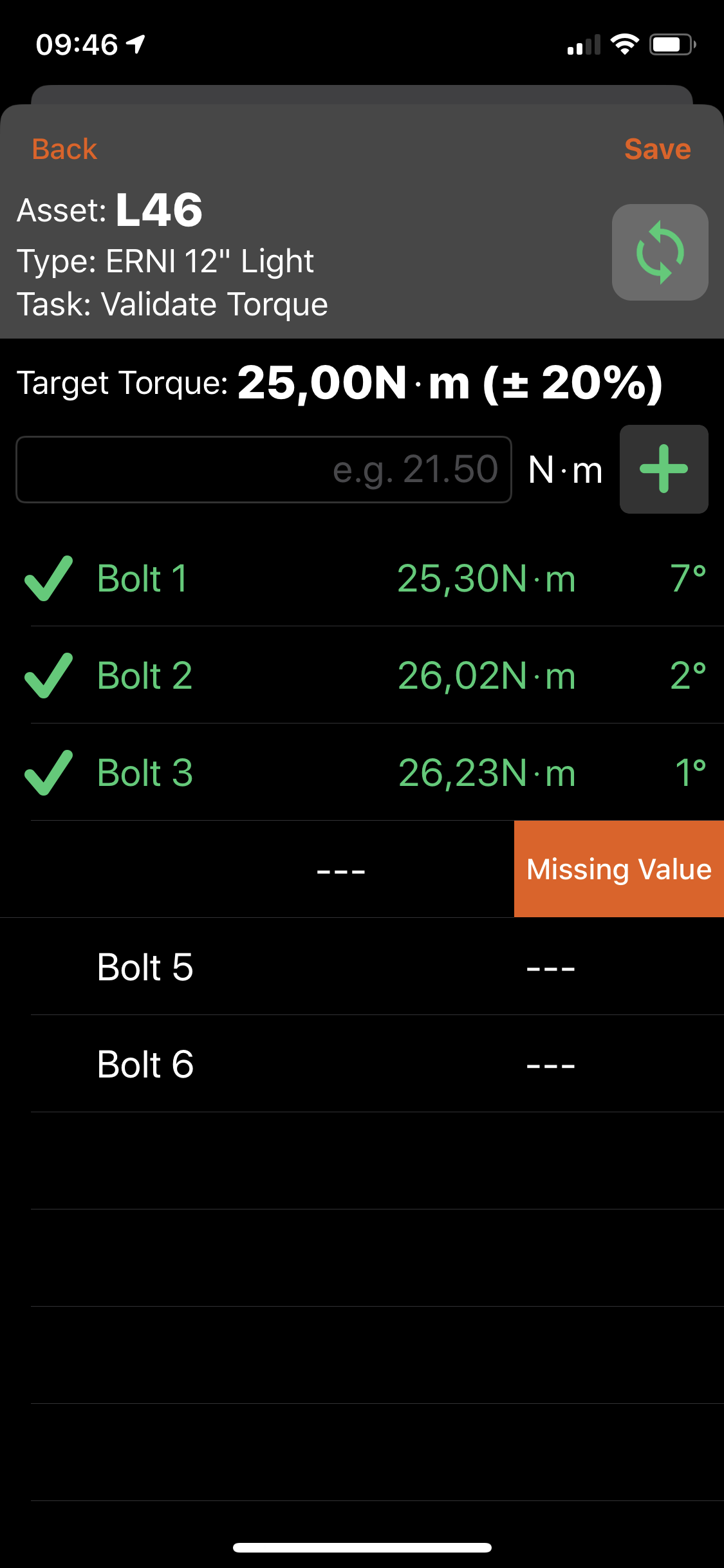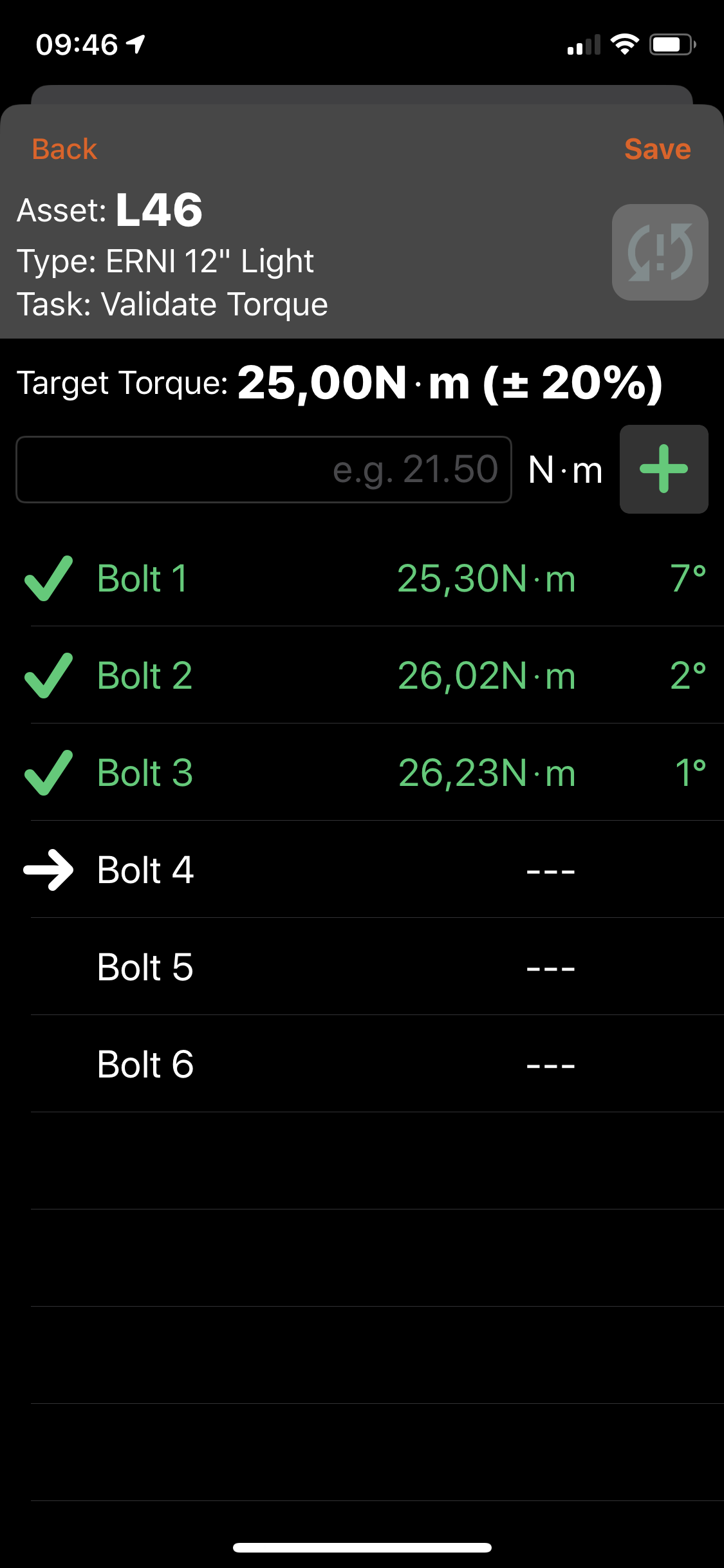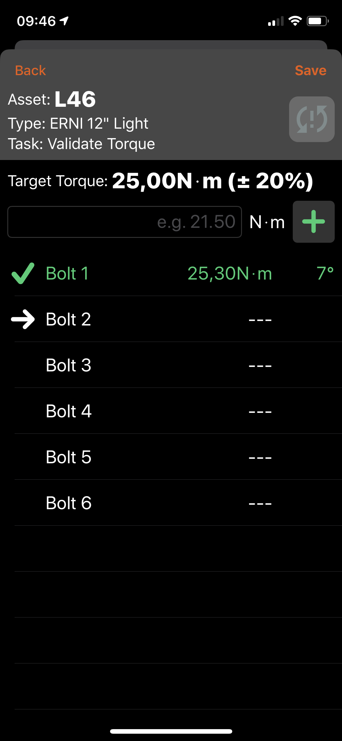 - Once all of the bolts are torqued ( or a manual value is inputted) the data can be saved