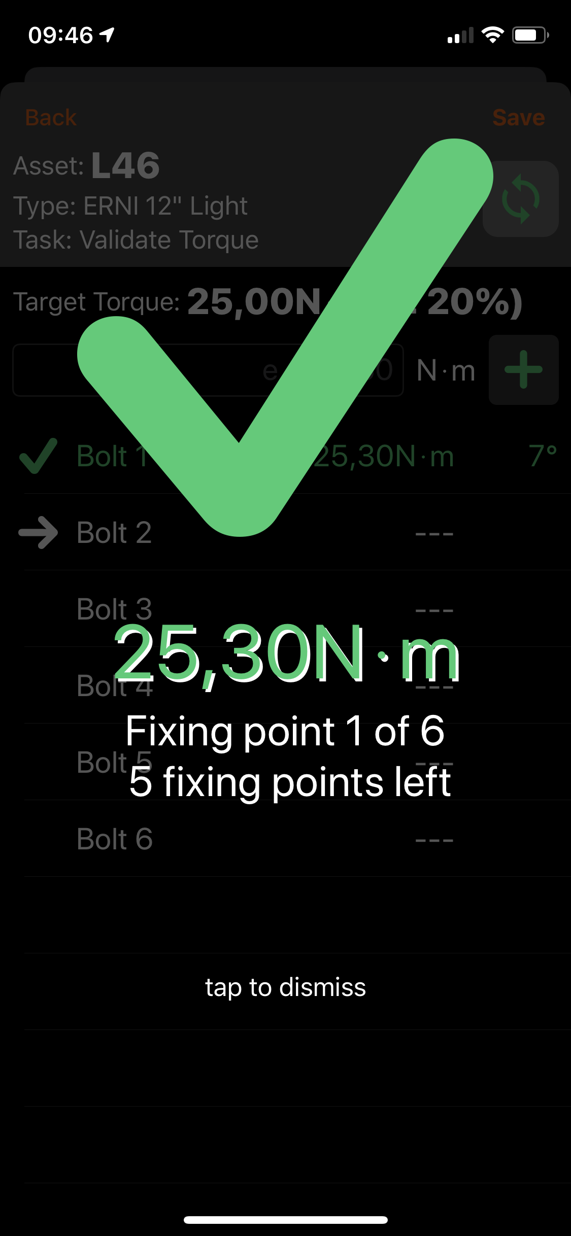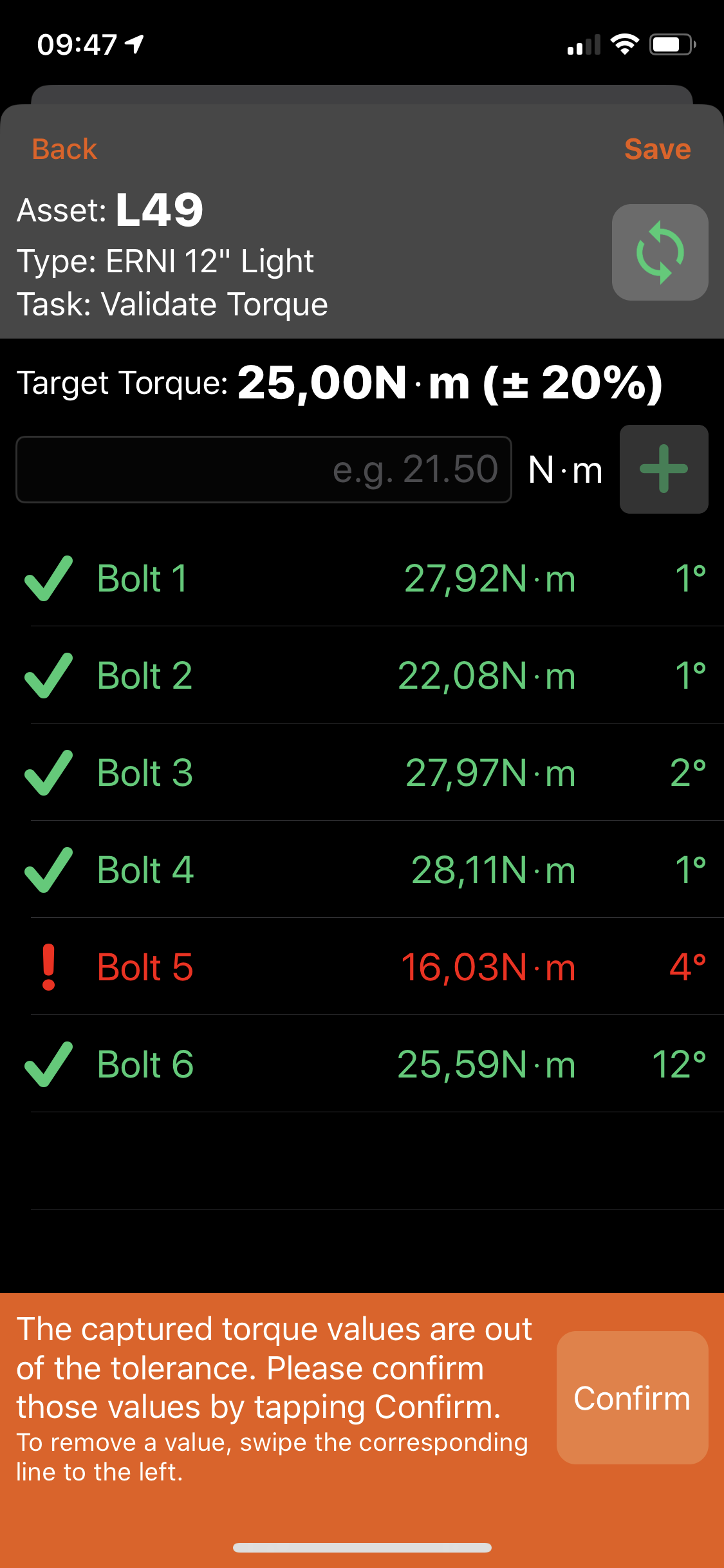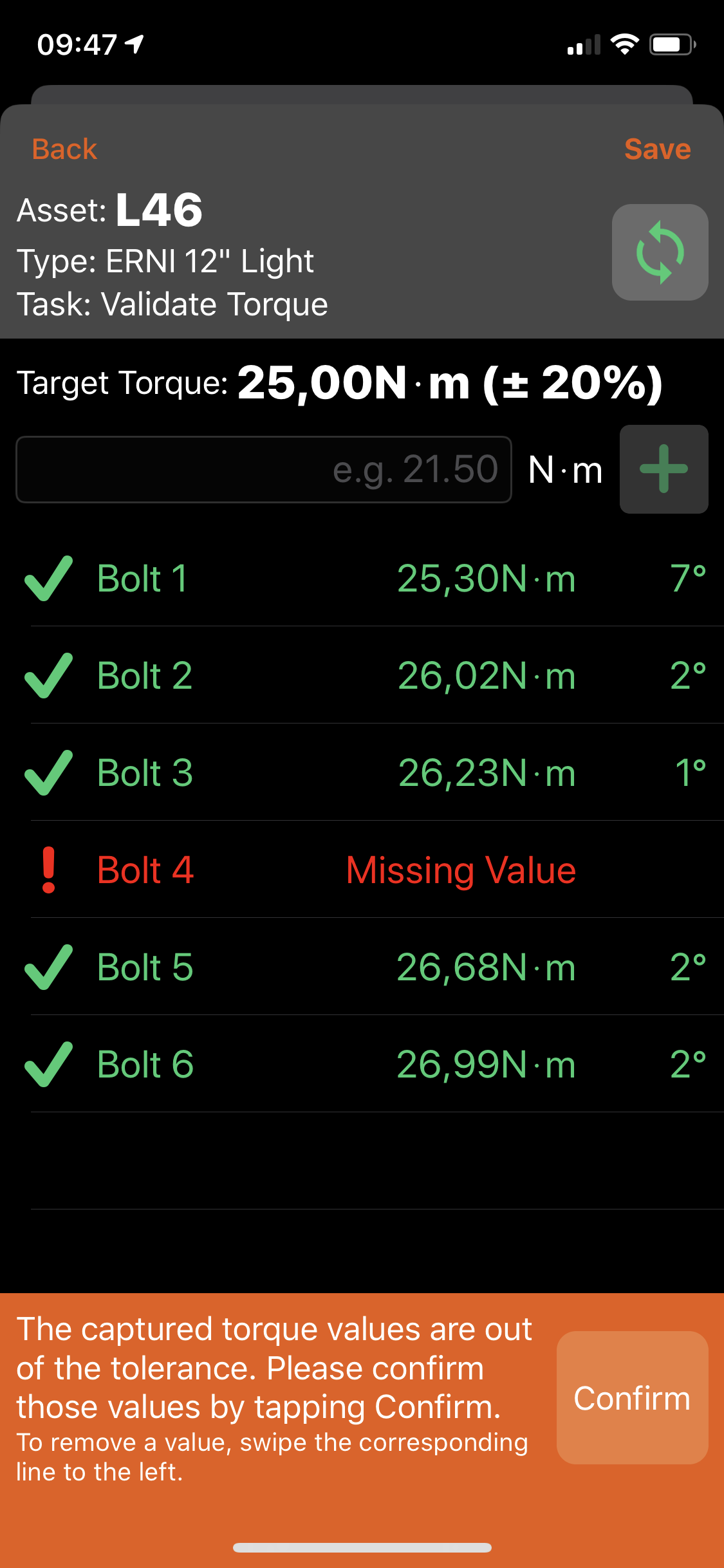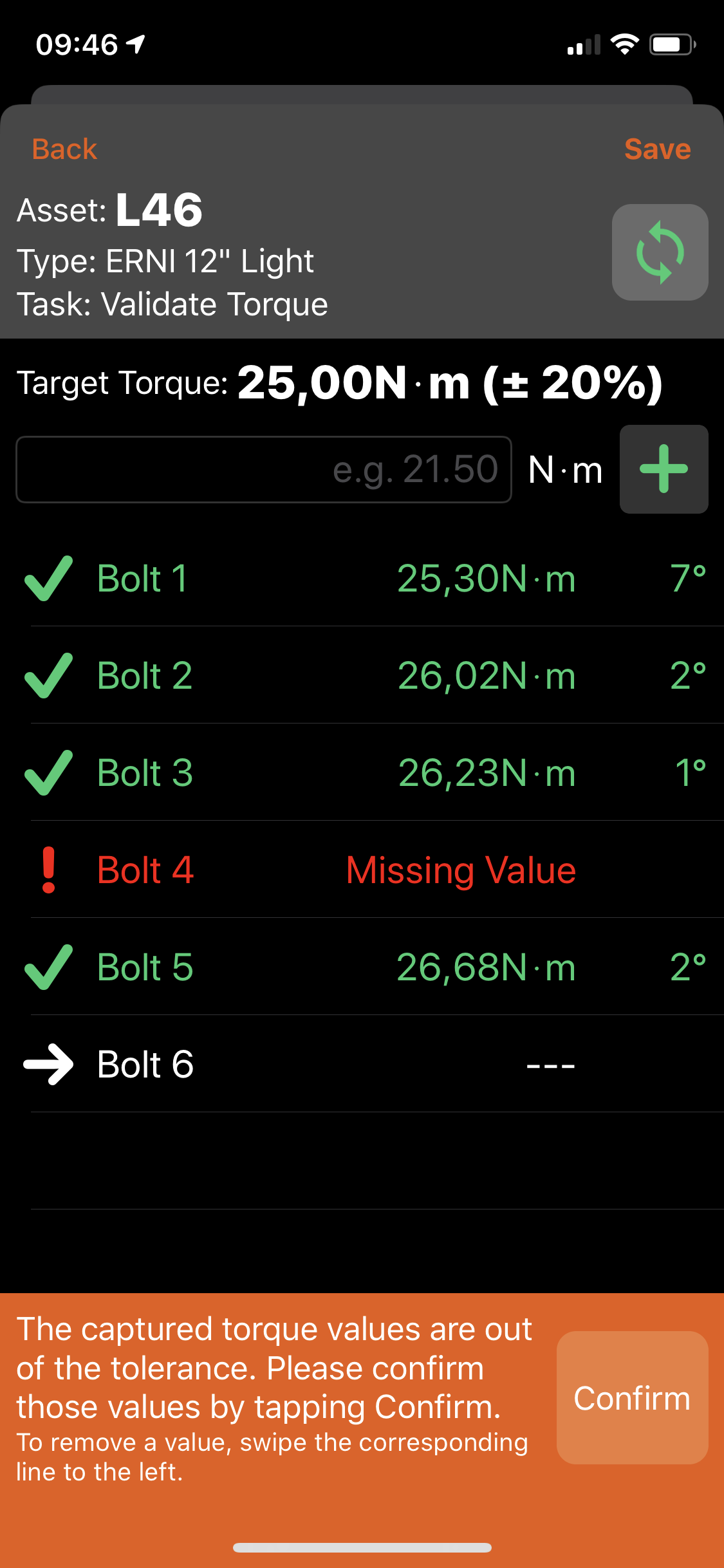 - Once all of the bolts are torqued ( or a manual value is inputted) the data can be saved