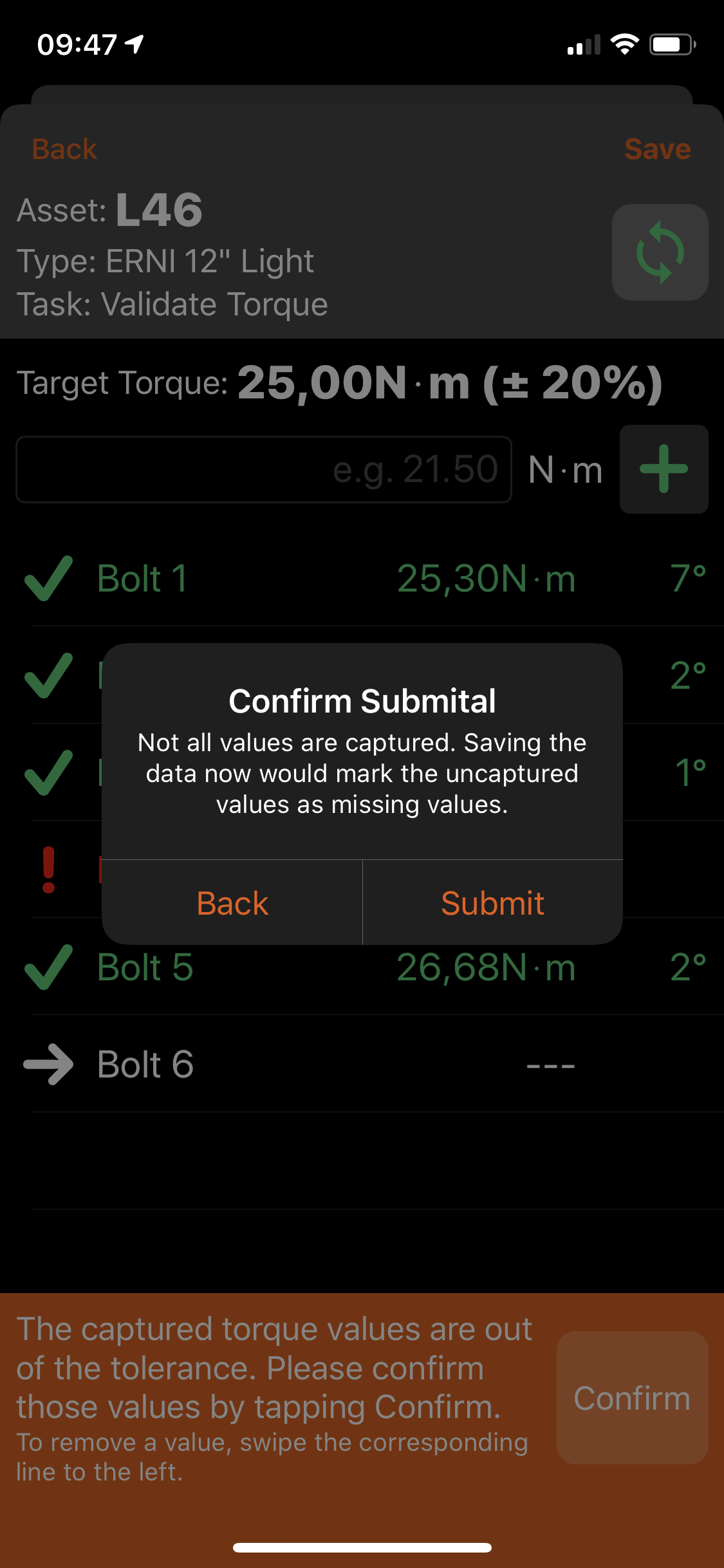 - If the maintenance action is saved without an entry of all bolts there will be a pop-up to inform you that all no-date bolts will be marked as missing bolts.