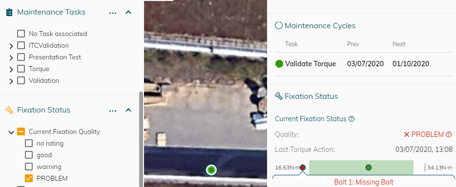 By using the fixation status filter → Problem , you will filter for all of the assets with missing bolts.